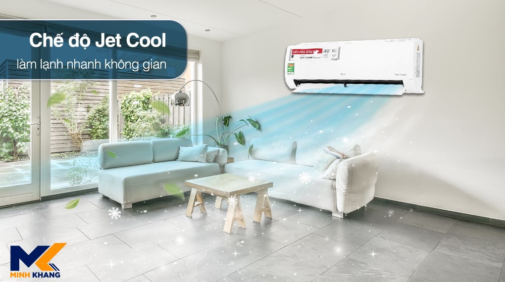 Điều hòa LG này nổi bật với khả năng làm mát nhanh chóng nhờ công nghệ Jet Cool cho máy chạy với tốc độ quạt mạnh nhất và hạ nhiệt độ xuống 5oC chỉ trong vòng 3 phút, tạo hướng gió được thổi xa để người dùng đắm chìm trong không gian mát lạnh tức thì. Đặc biệt, điều hòa được ứng dụng công nghệ Dual Inverter độc quyền của LG sử dụng máy nén biến tần có thể tiết kiệm lên tới 70% năng lượng tiêu thụ mà vẫn giữ khả năng làm lạnh ổn định, giảm rung lắc đến 80%. Đồng thời, công nghệ này còn giúp máy làm lạnh nhanh hơn đến 40% so với dòng máy thông thường, đem đến cảm giác dễ chịu cho người dùng.