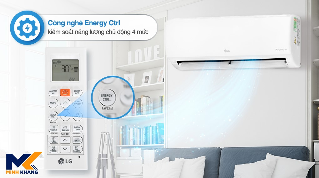 Điểm nổi bật nhất của điều hòa này đó chính là khả năng tiết kiệm điện vượt trội so với điều hòa thông thường. Điều hòa LG mới này được ứng dụng công nghệ Dual Inverter độc quyền của LG sử dụng máy nén biến tần có thể tiết kiệm lên tới 70% năng lượng tiêu thụ mà vẫn giữ khả năng làm lạnh ổn định, giảm rung lắc đến 80%. Thêm vào đó, chế độ kiểm soát năng lượng Energy Ctrl cho phép người dùng lựa chọn 4 mức công suất bao gồm 40, 60, 80, 100% để người dùng dễ dàng cài đặt theo nhu cầu và hạn chế hao phí điện năng tối ưu.