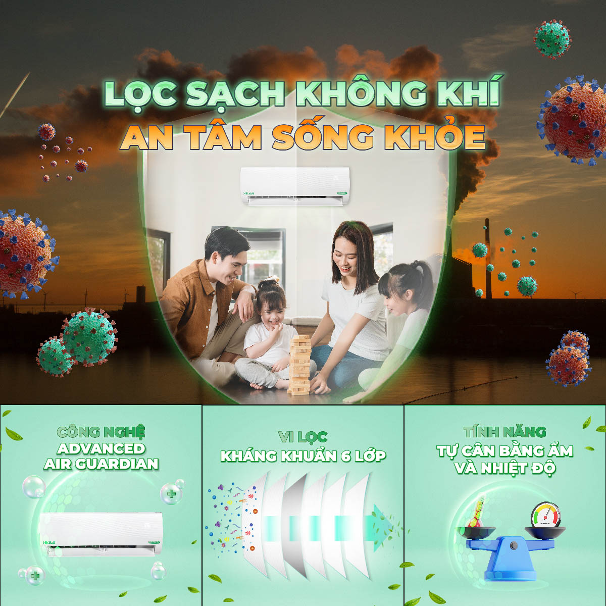 Điều hòa còn được trang bị công nghệ ADVANCED AIR GUARDIAN cùng hệ thống vi lọc siêu kháng khuẩn có khả năng giữ an toàn cho người dùng bằng cách giải phóng hàng nghìn tỉ ion âm và dương để tiêu diệt hiệu quả vi khuẩn, virus và các phần tử có hại.