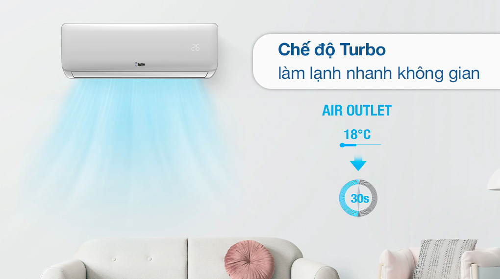 Bên cạnh thiết kế ấn tượng, điều hòa KoolMan này còn có khả năng làm lạnh cực nhanh nhờ chế độ Turbo. Khi chế độ này được kích hoạt, điều hòa sẽ vận hành ở công suất lớn nhất giúp nhanh chóng đưa không gian đạt tới nhiệt độ cài đặt. Nhờ đó người dùng có thể tận hưởng không gian mát lạnh sảng khoái mà không phải chờ đợi quá lâu như ở chế độ làm mát thông thường. Chế độ này rất thích hợp sử dụng vào mùa hè nắng nóng hay khi trong phòng có đông người sử dụng.