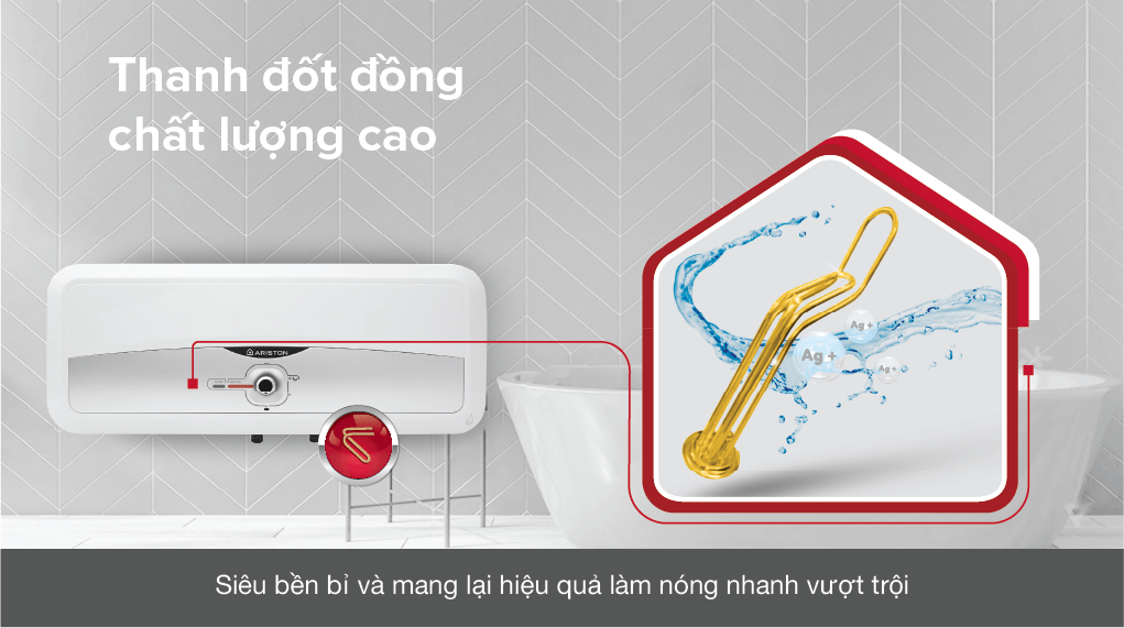 Bình nóng lạnh này sử dụng thanh đun nóng 100% bằng đồng giúp người dùng mau chóng có nguồn nước nóng sử dụng mà không phải chờ lâu. Ngoài ra tuổi thọ của thanh đốt cũng rất bền, người dùng không phải lo thanh đốt bị bám cặn ảnh hưởng đến khả năng đun nước.