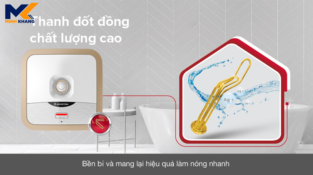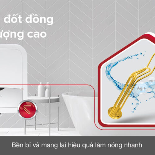 Bình nóng lạnh này sử dụng thanh đun nóng 100% bằng đồng giúp người dùng mau chóng có nguồn nước nóng sử dụng mà không phải chờ lâu. Ngoài ra tuổi thọ của thanh đốt cũng rất bền, người dùng không phải lo thanh đốt bị bám cặn ảnh hưởng đến khả năng đun nước.