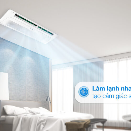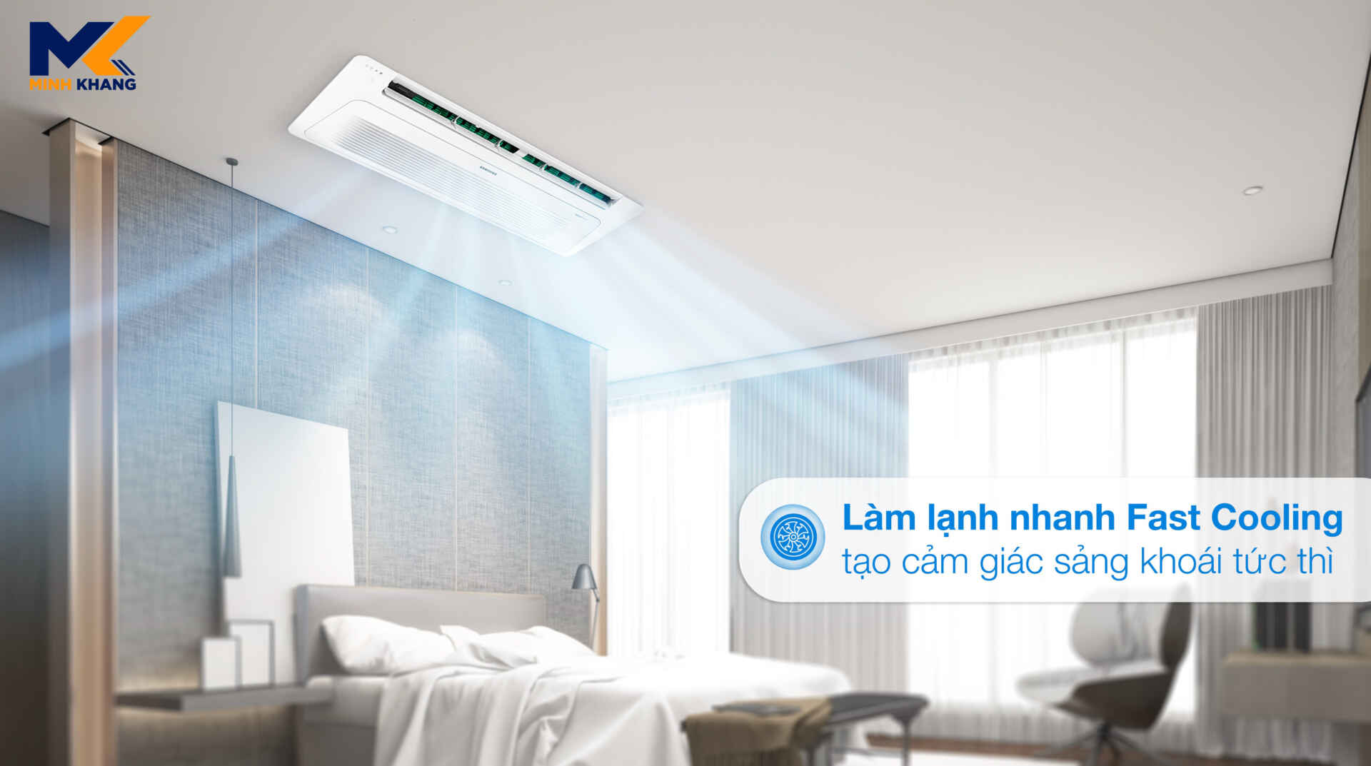 – Công nghệ Fast Cooling cho tốc độ làm lạnh nhanh hơn tới 43% so với tốc độ thông thường, quạt tăng áp được cải tiến giúp đẩy gió mát ra tối đa đến cả những góc thấp nhất, khu vực áp suất chênh lệch quanh cửa thoát được tạo ra cho khí lạnh đi ra song song cùng trần nhà, phát tán trên khu vực rộng lớn.