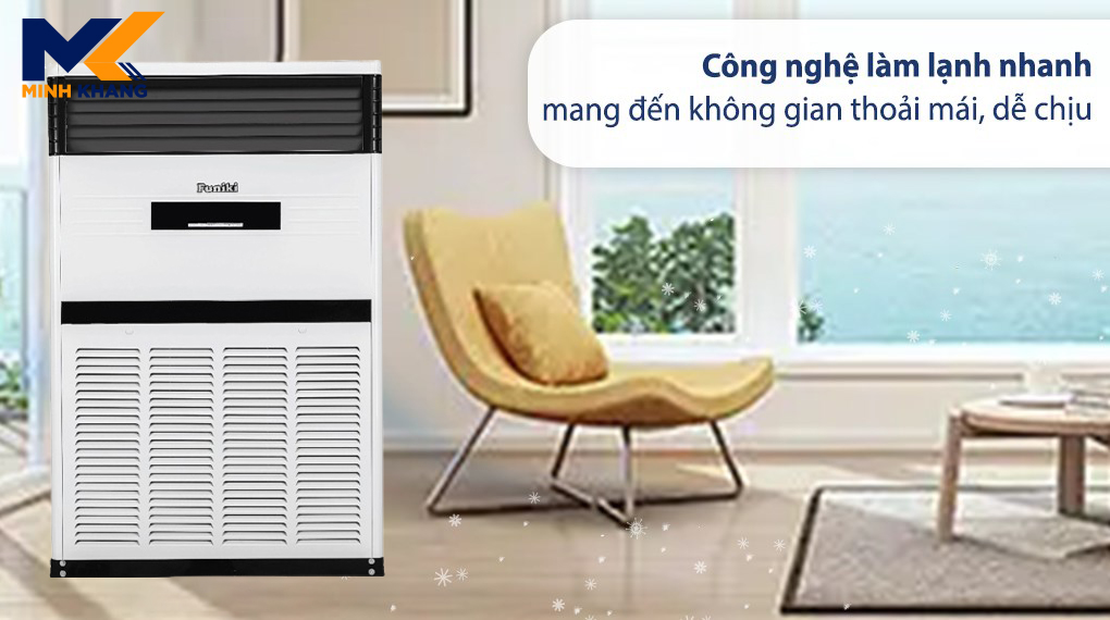 Mặc dù có thiết kế dạng đứng, điều hòa vẫn phân bổ luồng gió đều khắp căn phòng nhờ hướng gió với góc rộng, góc mở lớn giúp lưu lượng gió thổi ra nhiều hơn, giúp gia tăng khả năng làm lạnh nhanh của máy. Bên cạnh đó, quạt gió công suất cao sẽ giúp nhanh chóng lan tỏa luồng khí lạnh đi đến mọi ngóc ngách của căn phòng.