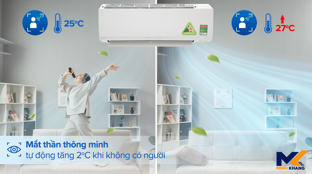 – Công nghệ mắt thần thông minh tiêu chuẩn: công nghệ này giúp tiết kiệm điện bằng cách phát hiện chuyển động của người trong phòng. Nếu trong vòng 20 phút không phát hiện ra bất kì chuyển động nào, máy sẽ tự động điều chỉnh tăng nhiệt độ cài đặt 2oC và giảm 2oC nếu phát hiện có người quay lại.