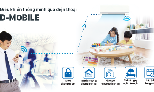 - Ứng dụng D-Mobile trên điện thoại thông minh cho phép bạn quản lý điều hòa từ bất cứ nơi đâu thông qua mạng internet, giúp duy trì không gian thoải mái tiện nghi cho ngôi nhà của bạn, đồng thời tiết kiệm điện.