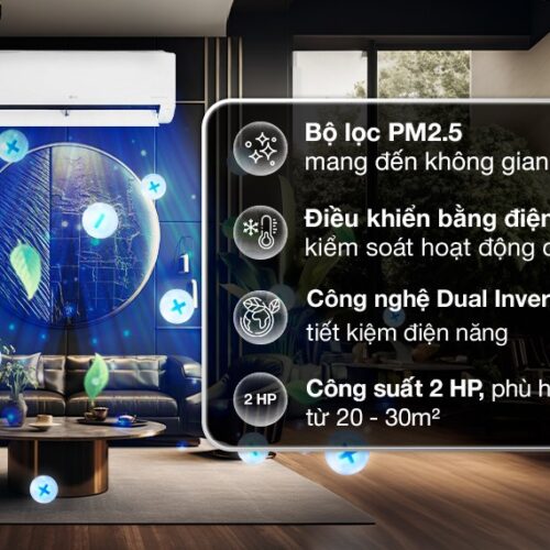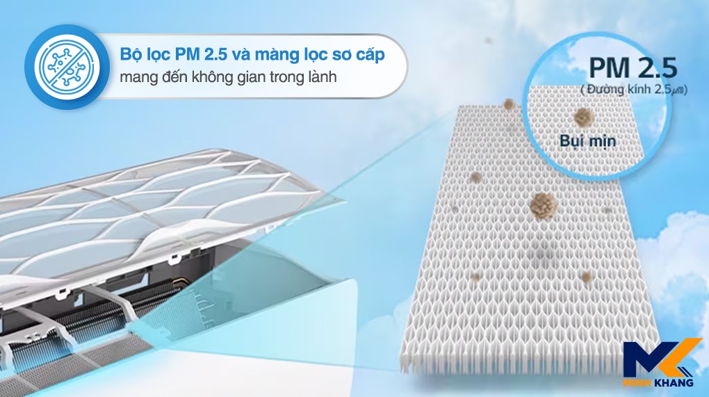Điều hòa được trang bị màng lọc sơ cấp, bộ lọc PM2.5 giúp diệt khuẩn, khử mùi, loại bỏ ngay cả hạt bụi mịn PM2.5 giúp cải thiện chất lượng không khí, bảo vệ sức khỏe cho người dùng. Thêm vào đó, chức năng tự động làm sạch giúp ngăn chặn nấm mốc, loại bỏ vi khuẩn, mùi hôi khó chịu giúp kéo dài tuổi thọ cho dàn tản nhiệt, giúp người dùng tiết kiệm thời gian, công sức và chi phí cho việc vệ sinh máy định kì.