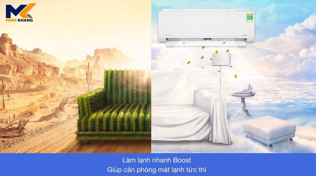 – Điều hòa Midea được trang bị chế độ Turbo hoạt động với công suất lớn giúp làm mát căn phòng nhanh chóng, đem tới cho người dùng không gian mát lạnh sảng khoái tức thì mà không phải chờ đợi quá lâu.