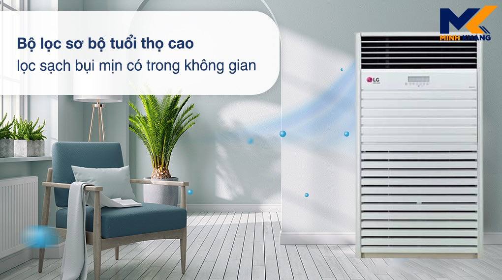 Điều hòa tủ đứng LG được trang bị bộ lọc tuổi thọ cao giúp loại bỏ bụi bẩn và chất gây dị ứng bên trong không khí, góp phần bảo vệ sức khỏe cho người dùng cũng như đảm bảo không khí bên trong phòng luôn tươi mát.