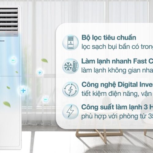 Điều hòa tủ đứng Samsung Inverter 28000BTU AC030BNPDKC/TC sở hữu thiết kế với cấu trúc gọn gàng và vững chắc, có khả năng di động linh hoạt cho phép người dùng có thể di chuyển máy và lắp đặt theo nhu cầu. Với bề mặt được phủ lớp màu trắng trang nhã, điều hòa dễ dàng hòa nhập vào mọi không gian, từ phòng khách đến phòng ngủ gia đình, tạo điểm nhấn sang trọng và tinh tế.