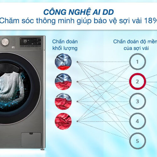 – Công nghệ AI DD cùng với động cơ truyền động trực tiếp sử dụng AI nhận diện khối lượng quần áo, độ mềm của trang phục từ đó tinh chỉnh chuyển động của lồng giặt để loại bỏ các vết bẩn hiệu quả trong khi bảo vệ chất liệu vải đến 18%.