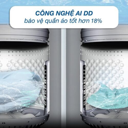 – Công nghệ AI DD cùng với động cơ truyền động trực tiếp sử dụng AI nhận diện khối lượng quần áo, độ mềm của trang phục từ đó tinh chỉnh chuyển động của lồng giặt để loại bỏ các vết bẩn hiệu quả trong khi bảo vệ chất liệu vải đến 18%.