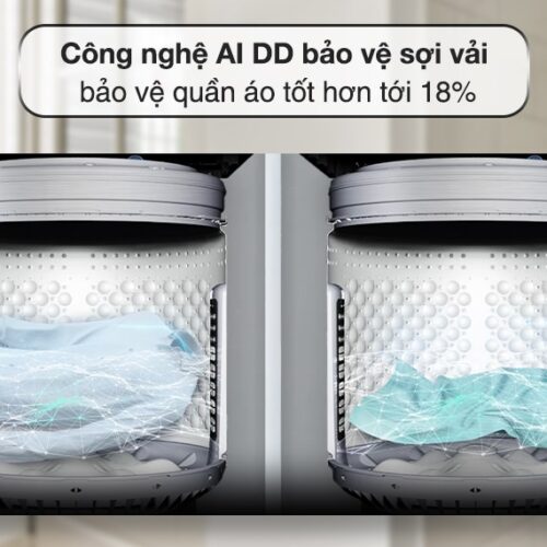 – Công nghệ AI DD cùng với động cơ truyền động trực tiếp sử dụng AI nhận diện khối lượng quần áo, độ mềm của trang phục từ đó tinh chỉnh chuyển động của lồng giặt để loại bỏ các vết bẩn hiệu quả trong khi bảo vệ chất liệu vải đến 18%.