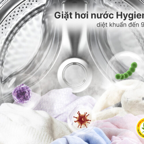 – Công nghệ Hygien Steam sẽ thổi hơi nước ở nhiệt độ cao từ đáy lồng giặt lên toàn bộ bề mặt và sâu bên trong sợi vải, giúp loại bỏ cặn bẩn và diệt đến 99.9% vi khuẩn, tác nhân gây dị ứng, bảo vệ sức khỏe cả gia đình.