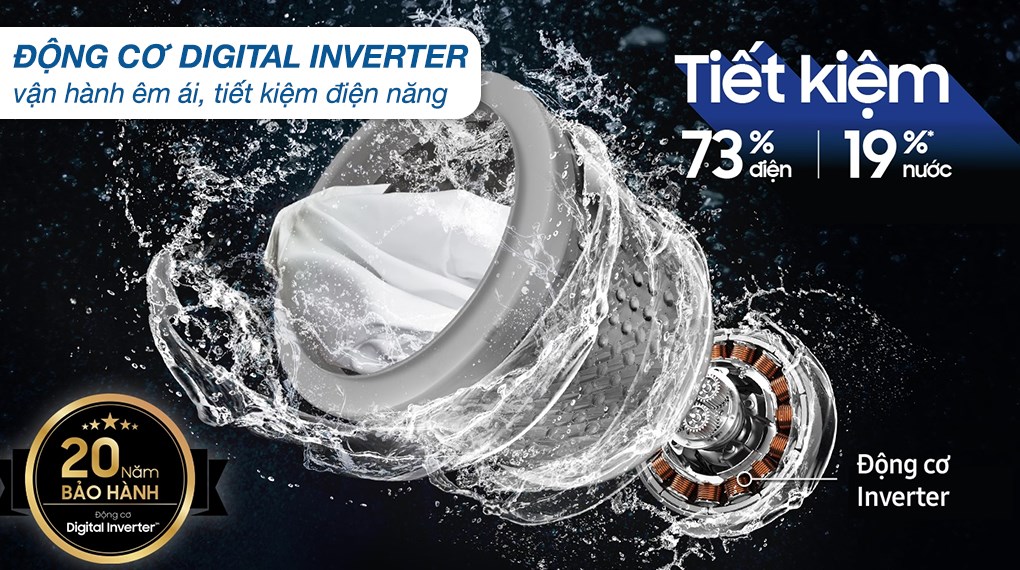 Máy giặt Samsung tích hợp động cơ truyền động trực tiếp, công nghệ Digital Inverter giảm thiểu ma sát khi hoạt động, đảm bảo thiết bị vận hành êm ái, tiết kiệm điện năng đồng thời sử dụng bền bỉ trong suốt quá trình sử dụng.