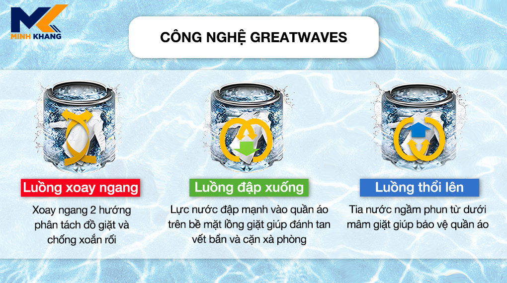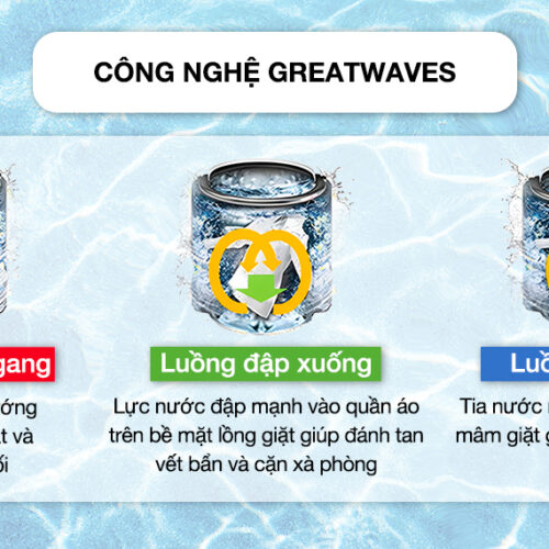 – Công nghệ giặt siêu sóng Greatwaves có khả năng tạo ra những cơn sóng mạnh mẽ từ các lỗ phun nước trên lồng giặt pha lê, kết hợp với thanh tạo sóng Paddle kích thước lớn để đánh bay vết bẩn trên quần áo dễ dàng mà vẫn giảm thiểu được tình trạng sờn vải và phai màu.