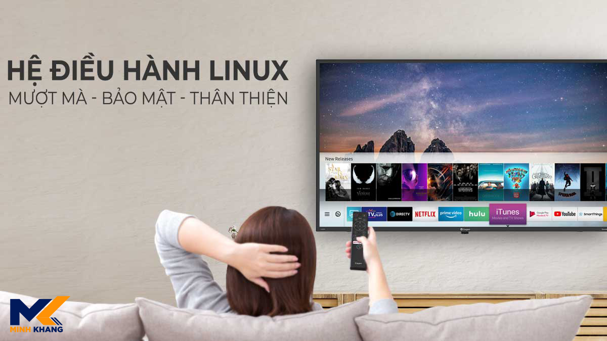 Smart Tivi Casper 43FX5200 sử dụng hệ điều hành Linux với giao diện được thiết kế đơn giản, đảm bảo tính ổn định cao và khả năng bảo mật tối ưu. Điều này giúp người dùng cảm thấy thoải mái trong việc điều khiển tivi, hệ điều hành này giúp tối ưu hóa tính an toàn, đồng thời cung cấp giao diện dễ sử dụng.