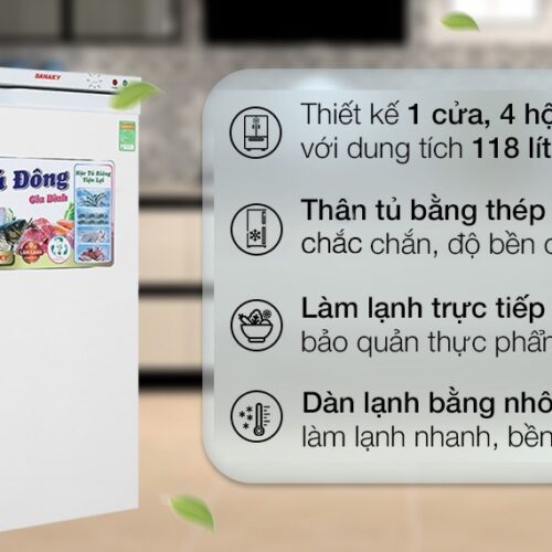 Tủ đông Sanaky 118 lít VH160VD sở hữu thiết kế nhỏ gọn cùng gam màu trắng tinh tế, kiểu dáng mở 1 cánh tiện lợi giúp tiết kiệm không gian đặt để nhưng vẫn đảm bảo lưu trữ được lượng lớn thực phẩm nhờ vào dung tích 213 lít. Thân tủ được làm bằng thép sơn tĩnh điện cao cấp, cửa tủ cấu tạo từ hợp kim nhôm phủ lớp sơn tĩnh điện đem lại độ bền đẹp, hạn chế oxi hóa và dễ dàng lau chùi.