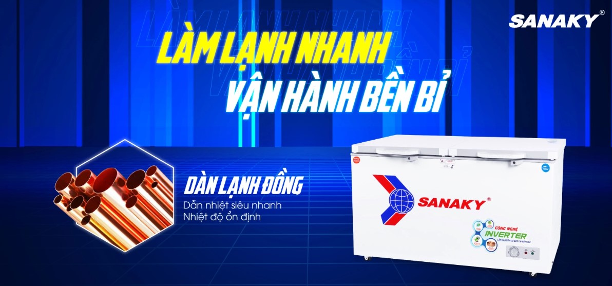 – Tủ đông Sanaky VH-5699W4K này được trang bị dàn lạnh bằng đồng nguyên chất với khả năng dẫn nhiệt nhanh, thời gian làm lạnh được đẩy nhanh hơn, giữ lại khi ngắt điện sẽ lâu hơn tủ lạnh có công nghệ làm lạnh thông thường. Nhờ đó thức ăn sẽ giữ được nguyên chất dinh dưỡng và tươi ngon lâu hơn.