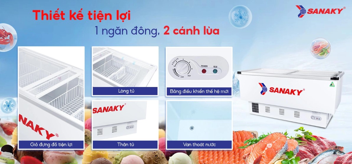 Tủ Đông Sanaky 516 Lít VH-999K là dòng tủ đông kính cong phù hợp sử dụng trưng bày hàng hóa với dung tích 561 Lít được trang bị công nghệ làm lạnh số 1 Việt Nam, tủ được ứng dụng nhiều cho các tiệm tạp hóa, siêu thị, nhà hàng. Lớp kính cường lực trên mặt tủ hoàn toàn có thể mang lại cho bạn sự đảm bảo chắc chắn như một bức tường hoàn hảo, khi vỡ sẽ tạo thành những hạt vụn như hạt ngô không sắc cạnh, không gây sát thương cho người xung quanh.