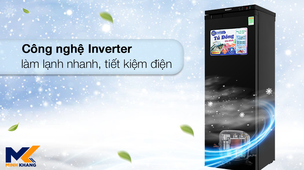 Tủ đông này được trang bị công nghệ Inverter kiểm soát hoạt động máy nén giúp thiết bị chạy êm ái, hạn chế tiếng ồn, rung lắc và cho hiệu quả tiết kiệm điện vượt trội so với dòng tủ mát thông thường.