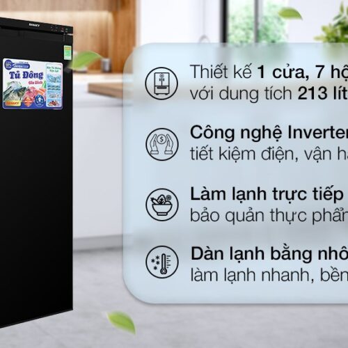 Tủ đông Sanaky Inverter 213 lít VH-230VD3 sở hữu thiết kế nhỏ gọn cùng gam màu đen cá tính, kiểu dáng mở 1 cánh tiện lợi giúp tiết kiệm không gian đặt để nhưng vẫn đảm bảo lưu trữ được lượng lớn thực phẩm nhờ vào dung tích 213 lít. Thân tủ được làm bằng thép sơn tĩnh điện cao cấp, cửa tủ cấu tạo từ hợp kim nhôm phủ lớp sơn tĩnh điện đem lại độ bền đẹp, hạn chế oxi hóa và dễ dàng lau chùi.
