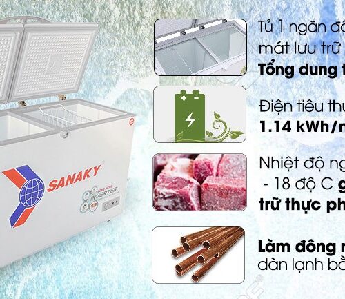 – Tủ đông Sanaky này được trang bị dàn lạnh bằng đồng nguyên chất với khả năng dẫn nhiệt nhanh, thời gian làm lạnh được đẩy nhanh hơn, giữ lại khi ngắt điện sẽ lâu hơn tủ lạnh có công nghệ làm lạnh thông thường. Nhờ đó thức ăn sẽ giữ được nguyên chất dinh dưỡng và tươi ngon lâu hơn.