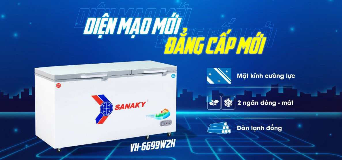 Tủ đông Sanaky VH-6699W2K có dung tích 485 Lít và thiết kế 2 ngăn đông – mát cùng 2 cánh mở trang bị kính cường lực mạnh mẽ. Tủ sở hữu công nghệ làm lạnh số 1 Việt Nam giúp đáp ứng mọi nhu cầu bảo quản thực phẩm của bạn, thích hợp sử dụng cho các cửa hàng bách hóa, nhà hàng, hộ gia đình từ 4-6 người,….Tủ được tráng 1 lớp mặt kính cường lực bền chắc giúp giảm khả năng va đập hay bị trầy xước, hoen rỉ theo năm tháng do người sử dụng hay có thói quen để vật dụng lên mặt tủ để tiết kiệm diện tích.